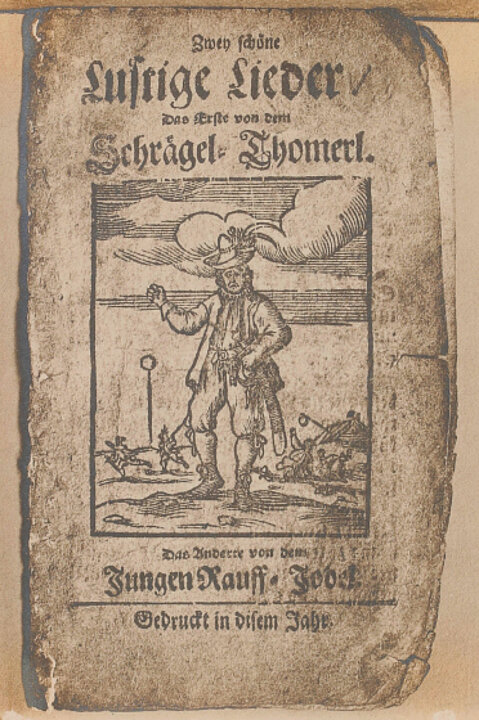 The figure was assembled or reconstructed from the illustration on a songsheet from the late 17th century. The Graz merchant Adolph Kroath had acquired the sheet at a ‘rag market’; it was passed on to Konrad Mautner, who as a folk song researcher was interested in the text. Mautner noted that the term Jodl was often used as a collective name for the rural population. Jodl is also translated in the literature as ‘noisy man’, ‘fool’, or ‘rude lout’. However, Konrad Mautner doubted that the ‘lad of thirty years’ was at home in the ‘noble Steyermark’, as the song text proclaims. Similar characters, according to later proponents of folk studies, were more often found in Bavaria, Tyrol, Salzburg or Upper Austria than in Styria. The Eisenerzer Bergreihen of 1655 tell of ‘Fäusthelden’ (‘fist heroes’) or ‘Räiffer’ (‘brawlers’) in Upper Styria and Upper Austria. These characters sometimes travelled for miles to duel with their peers at dances or weddings. In general, village events such as church fairs were frequently accompanied by brawls.