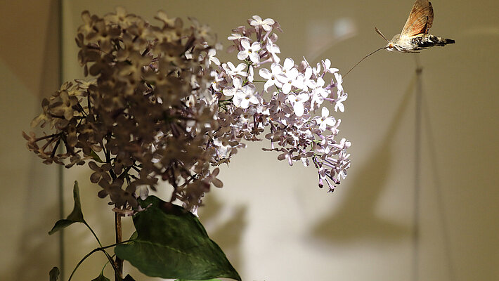 Das Zusammenspiel von Pflanzen und ihren Bestäubern ist ein Paradebeispiel für die Kreativität der Evolution. Hier zu sehen: Der Flieder und ein Taubenschwänzchen, Foto: Universalmuseum Joanneum/J.J. Kucek