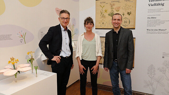 Das Kurator*innenteam von "Blümchensex" Kurt Zernig, Martina Pöltl und Gernot Friebes (v.l.) zeigt in der Ausstellung wie raffiniert, hochpräzise und erstaunlich erfolgreich das Liebesleben der Pflanzen ist, Foto: Universalmuseum Joanneum/J.J.Kucek