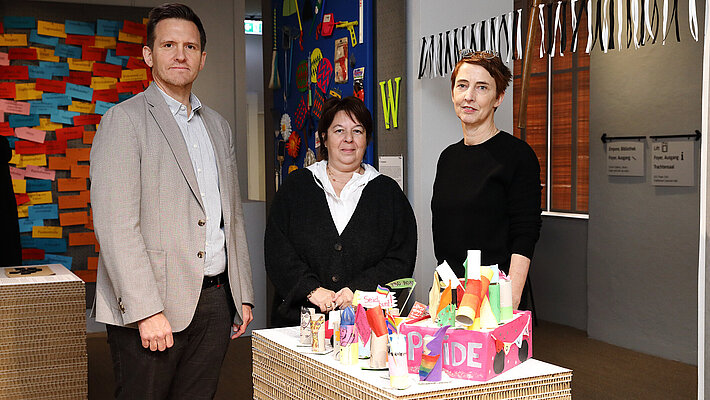 "UnSicherheiten als Alltag" im Volkskundemuseum: Marko Mele, wissenschaftlicher Direktor Universalmuseum Joanneum, Michaela Steinböck-Köhler, Leiterin der Abteilung Volkskunde und Birgit Johler, Kuratorin der Ausstellung, Foto: Universalmuseum Joanneum/J.J. Kucek