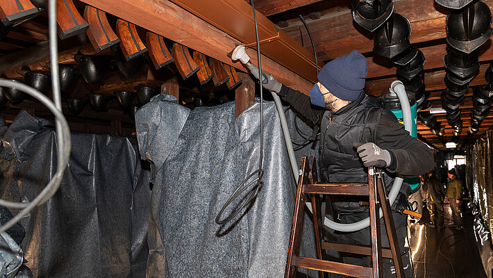 Die Umsetzung der Umbauarbeiten im Landeszeughaus stellt das Team immer wieder vor Herausforderungen: Das denkmalgeschützte Gebäude erfordert eine sorgfältige Planung und Abstimmung mit dem Bundesdenkmalamt. Hinzu kommt, dass die Durchführung während des laufenden Betriebs aufgrund der hohen Besucher*innenfrequenz – im Jahr 2025 zählte das Haus fast 60.000 Besucher*innen – nicht möglich ist. Deshalb wurden die Arbeiten bewusst in der Winterzeit angesetzt, in der ohnehin eingeschränkte Öffnungszeiten vorgesehen sind. Da das Gebäude wie viele historische Baudenkmäler über keine Heizung verfügt, näherten sich die Temperaturen im Jänner der Außentemperatur an, was sowohl das hauseigene Team als auch die externen Mitarbeitenden vor große körperliche und organisatorische Herausforderungen stellt.