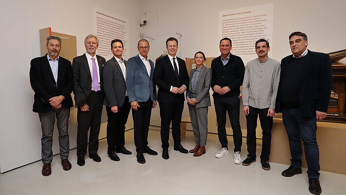 Dietmar Schubel (ÖBB-Projektleiter), Klaus Hasl (Marketingleiter WKO Steiermark), Marko Mele (wissenschaftlicher Direktor Universalmuseum Joanneum), Wolfgang Muchitsch (Direktor kärnten.museum Klagenfurt), Karlheinz Kornhäusl (Kulturlandesrat), Bettina Habsburg-Lothringen (Leiterin Museum für Geschichte), Josef Schrammel (kaufmännischer Direktor Universalmuseum Joanneum), Thomas Felfer (Kurator der Ausstellung), Walter Feldbacher (Kurator der Ausstellung), Foto: Universalmuseum Joanneum/J.J. Kucek
