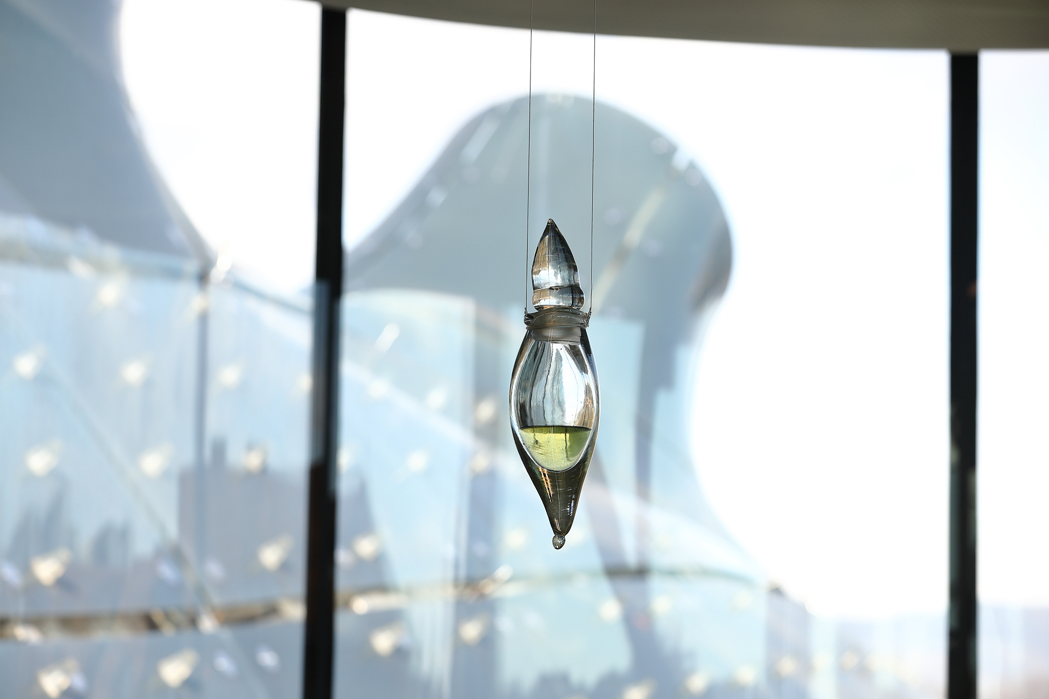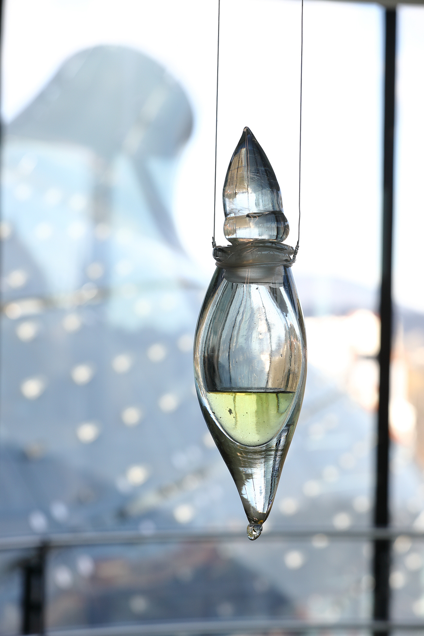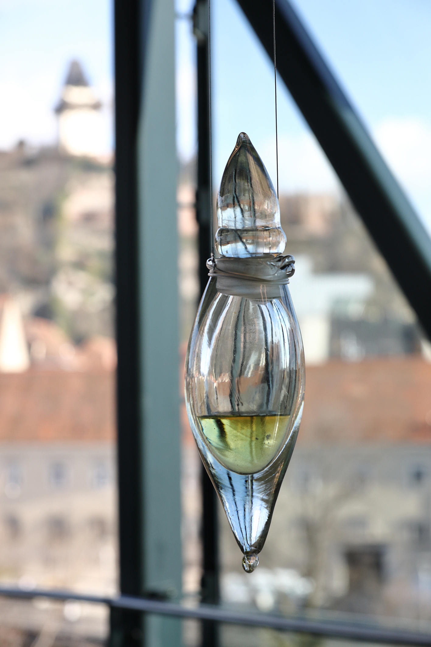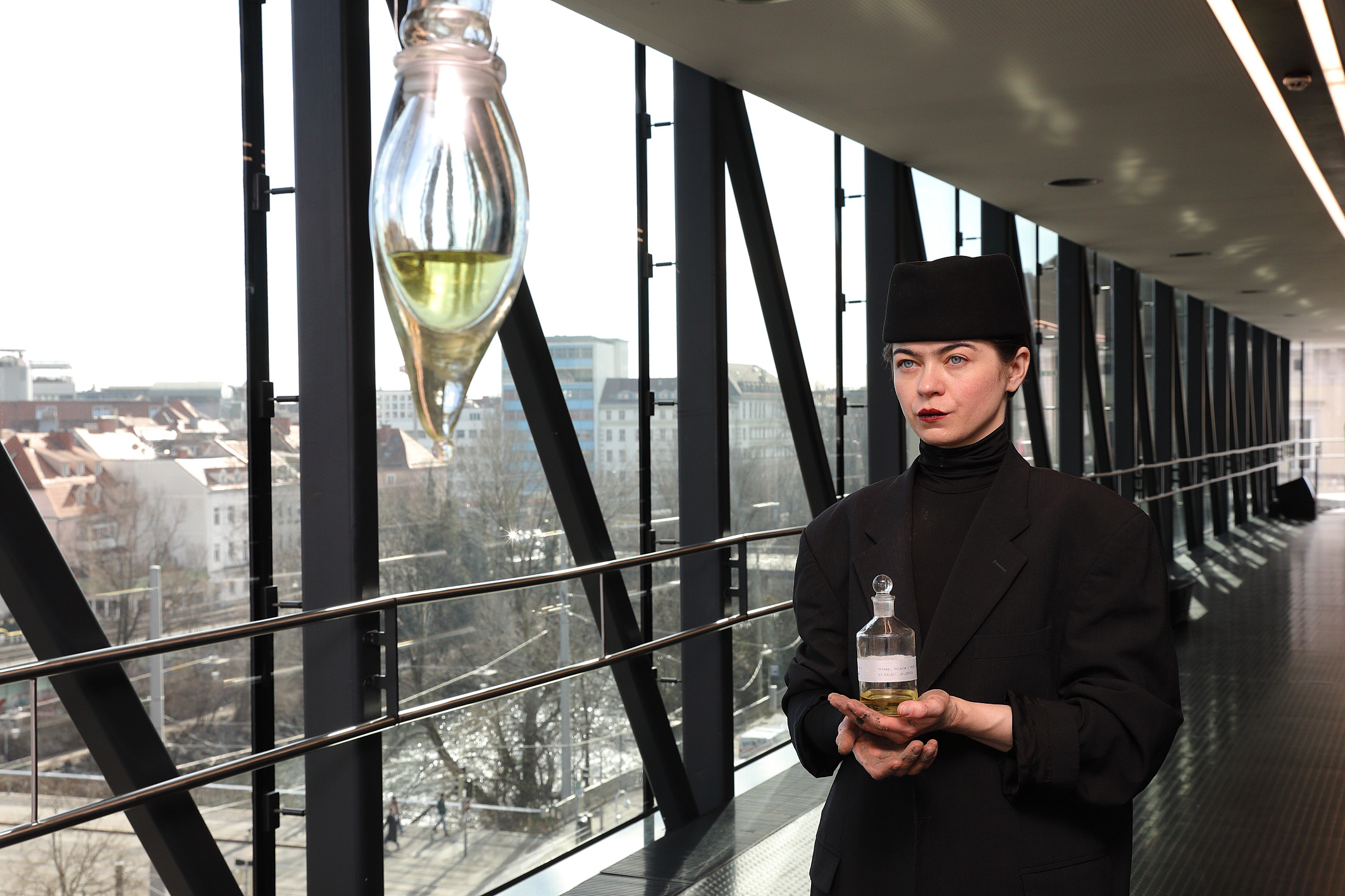 Smells are powerful memory triggers because they are directly connected to the limbic system. This enables them to instantly conjure up seemingly forgotten memories. The process of extracting the scent took Cemra several months and involved several stages. Layers of soil on Vaseline were changed three times every ten days, then covered with alcohol for another ten days and left to evaporate for 24 hours. Fat and ethanol preserved the scent of what had been taken from the artist. Thus, the extract in the installation remains visible in a hand-blown flacon but not directly smellable.