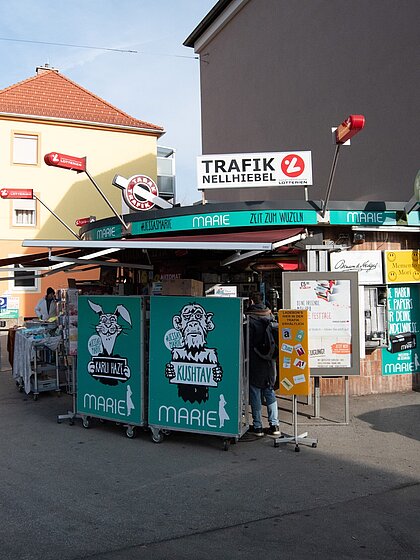 Centers of living with and next to each other in the Triester Strasse are, among other things, the tobacco shops. Four of them are located in the vicinity of several residential complexes, whose residents see these small businesses not only as local suppliers and service providers. They form a social network node and also constitute communities. Michael Zinganel and Michael Hieslmair manifest the results of the route network analysis around the respective tobacco shops in a “route network installation” near one of the tobacco shops: The sculpture consists of labyrinthine pipelines and signs, like abstract route maps, that trace the paths of the regular customers and proprietors. The pictograms on the provided signs show the routes taken by the residents of the district by imitating references to cultural monuments. The three other tobacco shops were signposted with the abstracted route network in relation to the respective tobacco shop. In a subtle way, invisible traces are visualized by the artists in a three-dimensional social map and centers of meaning are thus represented graphically.