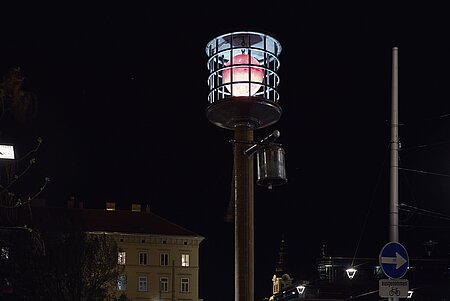 Light means life. A lighthouse means survival. If its light goes out, ships are in danger of being dashed to pieces on rocks. The tower stands in Kapistran-Pieller-Platz alongside Hauptbrücke. Pulsating gently in the rhythm of the human heart, it emits powerful beams of light whenever a child is born in Graz as a sign of welcome. This happens ten to fifteen times a day.