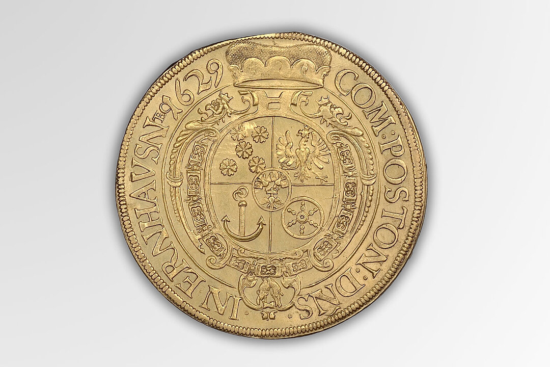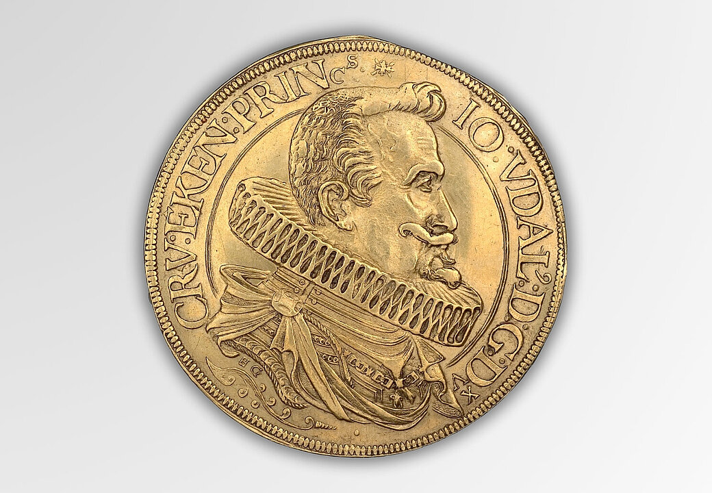 Hans Ulrich von Eggenberg (1568–1634) was rewarded by Emperor Ferdinand II for his loyal service with a wealth of offices and honours. Among other things, he received the dominion of Krumlov in Bohemia in 1622 and was elevated to the rank of prince in 1623. In a palatine charter dated 24 February 1625, the emperor granted him and his descendants the right to “mint and strike all kinds of gold and silver coins, large and small, with inscriptions, images, coats of arms and embossing on both sides, in accordance with the imperial coinage regulations”. A tenfold ducat of Hans Ulrich von Eggenberg from 1629 is one of the rarities in the Coin Cabinet of the Universalmuseum Joanneum.