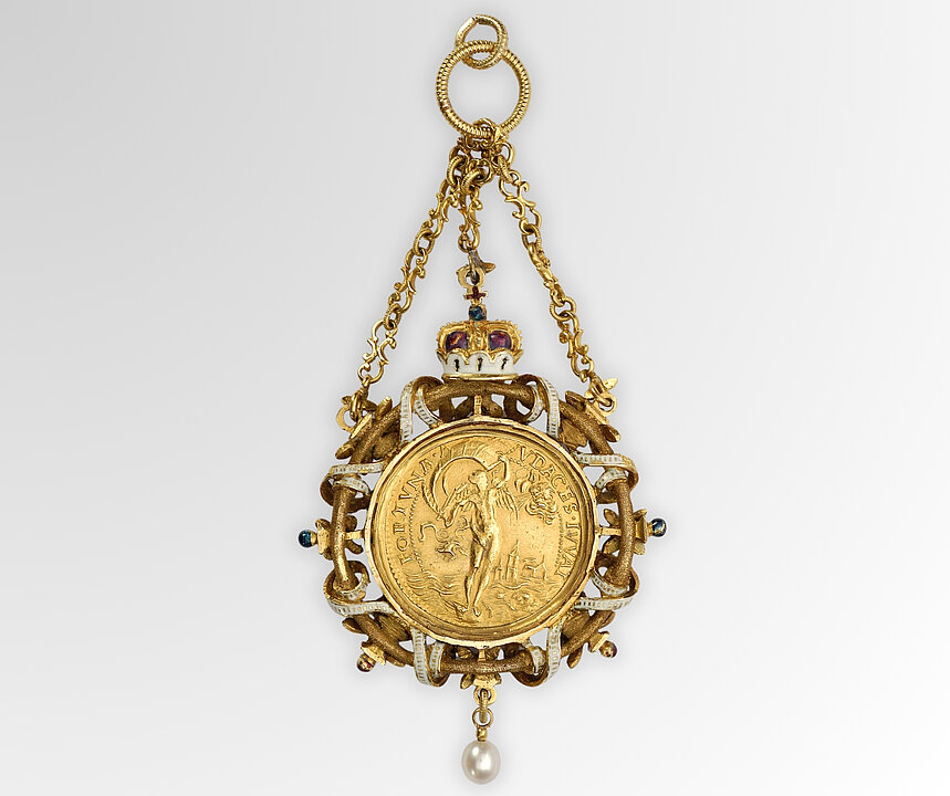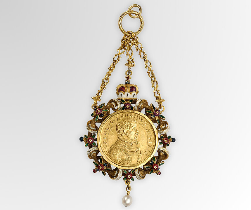 In 1567, Italian medallist Antonio Abondio created a pendant medallion for Archduke Charles II of Inner Austria. The portrait on the obverse shows Archduke Charles II of Inner Austria looking to the right, with short curly hair and a narrow ruff, his upper body clad in ceremonial armour and girded with a field belt. The reverse features the archduke's motto, ‘Fortune favours the bold,’ and the goddess of fortune, Fortuna.