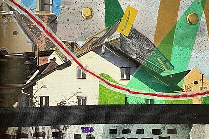 Ukrainian artist Anton Tkachenko - in Graz since 2023 - creates landscapes for the foyer in which mountains, bridges, rows of houses, but also plants, figures and blooming flowers are intertwined: Hope, vision or just more shadows of Sisyphean attempts at resistance?