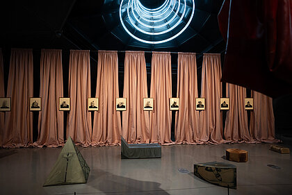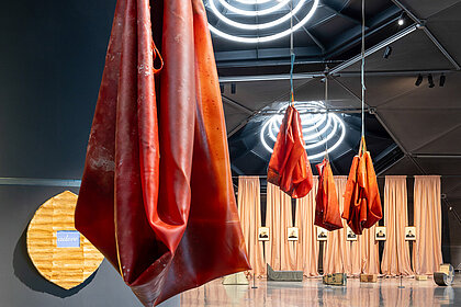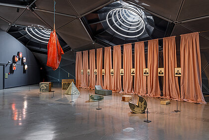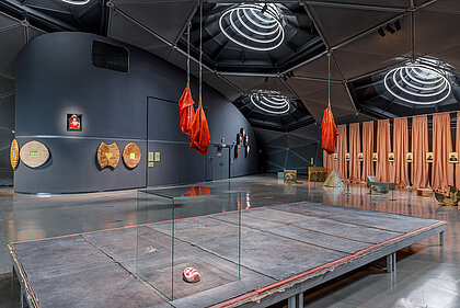 Raff’s sculptures—made of latex, metal, or standardised stage elements—complement the retrospective with a quiet sensuality. Her forms respond physically and receptively to Chadwick’s hybrid conceptual space, opening up new, contemporary readings of material, the body, and language. The dialogue between the two positions follows the concept of hybridity—implicitly inspired by Homi K. Bhabha—and, through Raff’s exhibition design, gives rise to a “third space” dedicated to the processual and the living. Over the course of the exhibition, this space will host live events and performances that respond to and activate the shared themes.