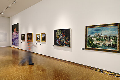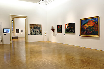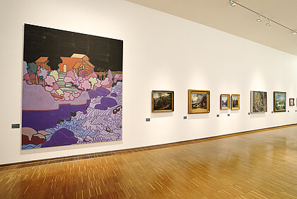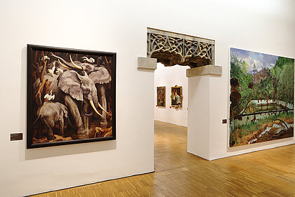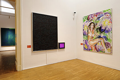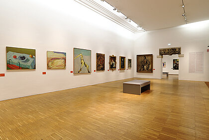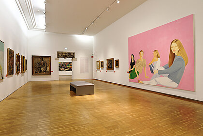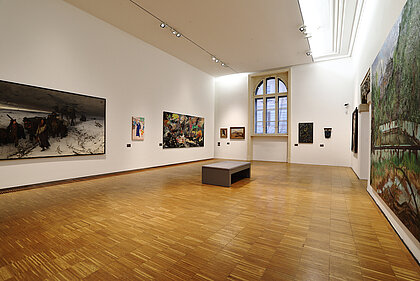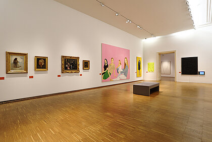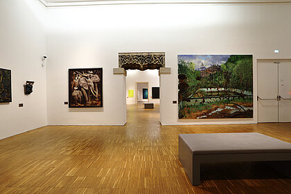 War, ecological disaster, and the visualisation of nature thereby become clear. What emerges is not a linear sequence based on art history, rather a linked-up structure, an overarching narrative. What became of the nude? Once an idealisation of the human body – emanating from the spirit of antiquity – it has turned into an arena of mental phenomena in the 20th century, or a bundle of data. Distance and closeness now have different connotations than in the 19th century, at the time of oriental fashion and unrestrained colonialism and cultural imperialism. These two terms are now epitomised by flight, migration and xenophobia. Post-colonial upheavals represent our main area of concern these days. The changing geo-political framework obviously underpins these conditions. At the end of the exhibition, narrative structures dissolve. Abstraction, the expansion of panel painting, the break-up of classical categories, an examination of the system of art itself or mediatisation now dominate.