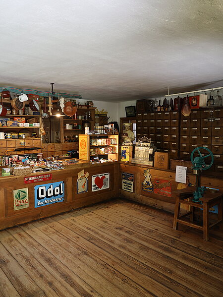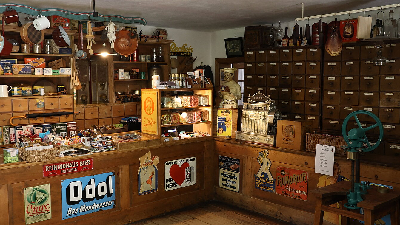 Today you can find sweets, old tin brand signs, cross-stitch patterns and an old wrought-iron cash register. In this historic atmosphere, visitors can also buy products such as museum guides and sweets like Krachmanderl.