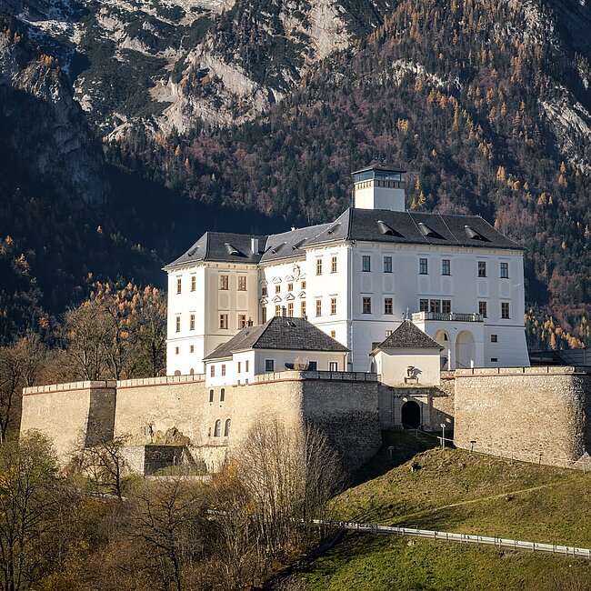 The imposing form of Trautenfels castle rises majestically from the valley floor. This location was first occupied by a castle called Neuhaus in 1261. Here, on the crossroads of the salt route and the road along the Ennstal valley, it served to guard the river Enns crossing and the Styrian border a few kilometres to the west. In the thirteenth century, the principality’s castle passed into the possession of the Salzburg archbishopric. In the succeeding conflicts between the archbishop and the prince of Styria, the castle was conquered and destroyed at the end of the thirteenth century. Once reconstructed, Neuhaus took on great significance under the Praun family and above all under the Hoffmann family. During the reformation, Neuhaus developed into a centre of the new faith. Evidence of this is to be found in the remains of the foundation walls of a protestant church destroyed in 1599 and uncovered a few years ago a short distance from the castle. In the counter reformation that followed, the strategic importance of Neuhaus faded.