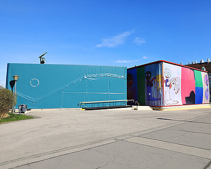 The curtain walls of the pavilion are dominated by a monumental digital painting by Hubert Schmalix. It runs around the entire pavilion. The partial opening and closing of the curtains heightens the character of the spectacle. The images essentially refer to digital communication – emojis. They are focused on gazes and clear gestures and, in Schmalix’s work, become instructions for action – they either instruct or attract