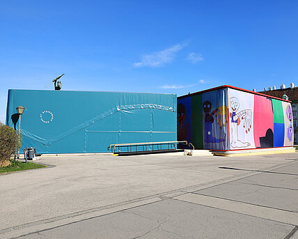 The pavilion provides a clear architectural guideline. An intermediate ceiling-like section divides the overall space diagonally, horizontally. In one part of the pavilion, a stylized mountain range symbolizes the topography of Styria – Hoch vom Dachstein an .... Herbert Brandl has enlivened this zone in the tradition of panorama painting. The monumental painting leads the public to the beauty of the Alpine landscape as well as reminding them of the storms of the country’s turbulent history. The pavilions also refer fundamentally to their locations. Mariazell as a prominent place of pilgrimage and Leoben with its long mining tradition are both located in extensive woodland with a strong forestry industry.