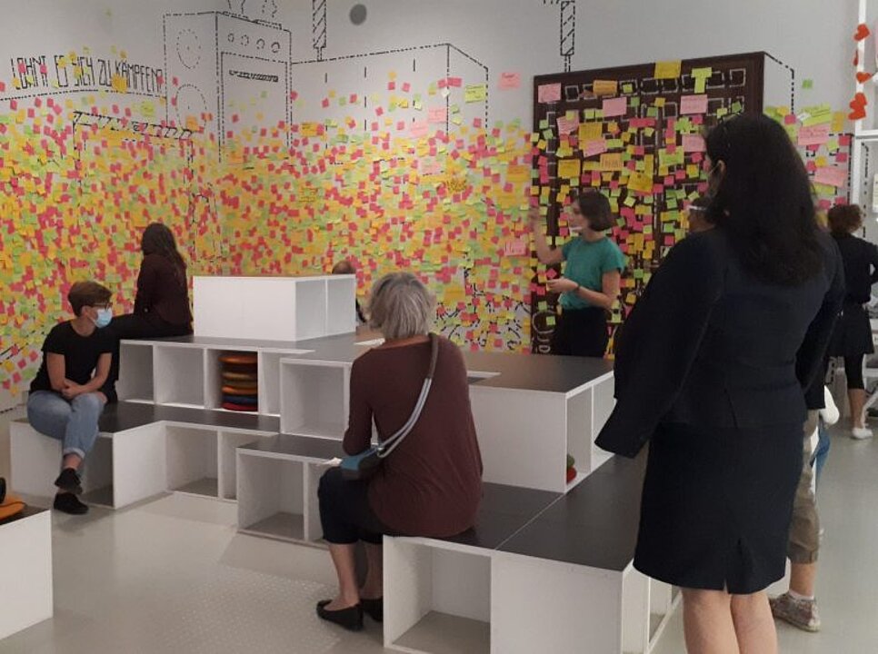 Der Kurator und die Teamleiterin der Vermittlung gaben Einblick in die enge Verzahnung ihrer Tätigkeiten mit jener von weiteren Mitarbeiter*innen des Hauses. In einem Rundgang durch die kürzlich überarbeitete Hauptausstellung wurden verschiedene Resultate des gemeinsamen Arbeitens vorgestellt. So zum Beispiel einzelne Displays, die prozesshaft angelegt sind und Besucher*innen einladen, über Sicht- und Unsichtbarkeit von Objekten im Museum zu entscheiden und damit die Frage nach Deutungsmacht reflektieren. Oder auch Raumordnungen, die nach gemeinschaftlicher Evaluation verändert wurden und nun mehr Platz für die Arbeit mit Besucher*innengruppen an zentralen Stellen in der Ausstellung geben, bis hin zu digitalen Ausstellungsflächen, die nur von Besucher*innen befüllt und damit laufend erweitert werden. Neben der laufenden Aktualisierung der Hauptausstellung (aktuell etwa mit der „Ibiza-Affäre“ des letzten Jahres) werden einzelne Bereiche überhaupt entsprechend eines Rapid-Response-Collecting-Ansatzes dynamisch kuratiert. Aktuelle Themen bilden hier zum Beispiel die „Fridays for Future“- oder „Black Lives Matter“-Bewegungen bzw. die Zeit des Lockdowns im Frühjahr 2020. Gemeinsam gearbeitet wird auch an vielen Angeboten des Museums im Netz, so zum Beispiel an der Web-Ausstellung Österreich anderswo oder den zeitgeschichtlichen Unterrichtsmodulen.