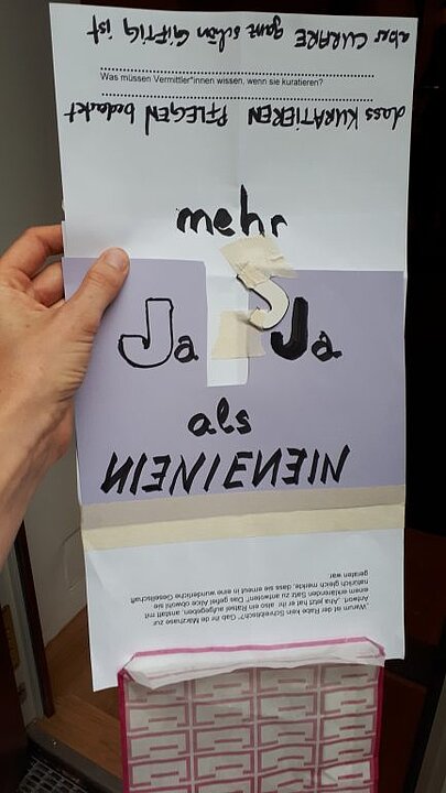 Angeregt durch einen zufällig erlangten Textausschnitt und eine kleine Materialbox, gestalteten die Teilnehmenden Sinnbilder, Denkfiguren, Collagen, die teils ihre Wahrnehmungen und Erfahrungen und teils ihre Utopien zu Co-Produktionen von Vermittlung und Kuratorischem abbildeten. Die Sicht und Darstellung der Einzelnen blieb dynamisch, denn die gestalterischen Produkte wechselten von der Urheber*in zu einer weiteren Person. In der weiteren Bearbeitung wurden die Versuchsminiaturen kommentiert, erweitert und verschieden interpretiert. Sehr sichtbar machte diese Übung die Fülle an Perspektiven, Angelpunkten der (Zusammen-)Arbeit und Kontexten, über die sich nachdenken lässt, will man zu einem produktiven Austausch jenseits streng disziplinären Denkens innerhalb des Museums gelangen.