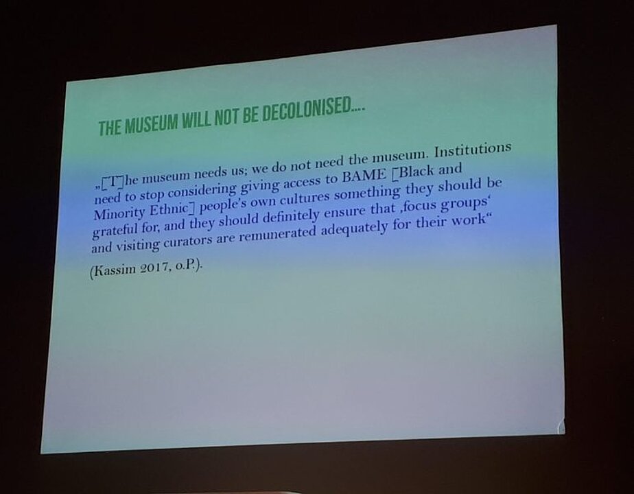 Den vielen Praxisbeispielen vorweg lieferte uns Nora Landkammer ein theoretisches Fundament, indem sie im Feld wirksame Diskurse und Handlungsmuster sichtbar machte. Die Basis ihrer Ausführungen bildete eine empirische Studie mit Fokus auf ethnologische Museen in Deutschland, Österreich und der Schweiz.