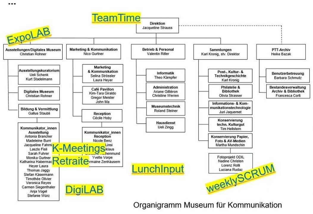 Mit dem seit 2017 im MfK neu ins Leben gerufenen Berufsbild der Kommunikator*innen und durch die allgemeine Bereitschaft zentraler Akteur*innen des Museums wurde in Bern die Grundlage für etwas geschaffen, das von Gallus Staubli heute als die Praxis des >dynamischen Kuratierens< bezeichnet wird. Das dynamische Kuratieren beschreibt einen Modus enger Zusammenarbeit zwischen Kurator*innen und Vermittler*innen. Als sehr zentral stellt Staubli das Etablieren von verschiedenen „Sitzungsgefäßen“ – verschiedenste Formate des Austausches – heraus. Formate wie das „weeklySCRUM“, das „ExpoLAB“, der „LunchInput“ und weitere bieten den Mitarbeitenden in regelmäßigen Abständen einen Rahmen, um in unterschiedlicher Zusammensetzung, Atmosphäre und Zielsetzung zusammenzukommen und verschiedene Fragen und Themen des professionellen Alltags zu besprechen.
