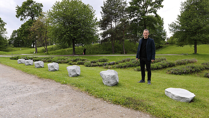 Christoph Weber neben seiner Skulptur "sechs komma vier", 2021, Foto: Universalmuseum Joanneum/J.J. Kucek