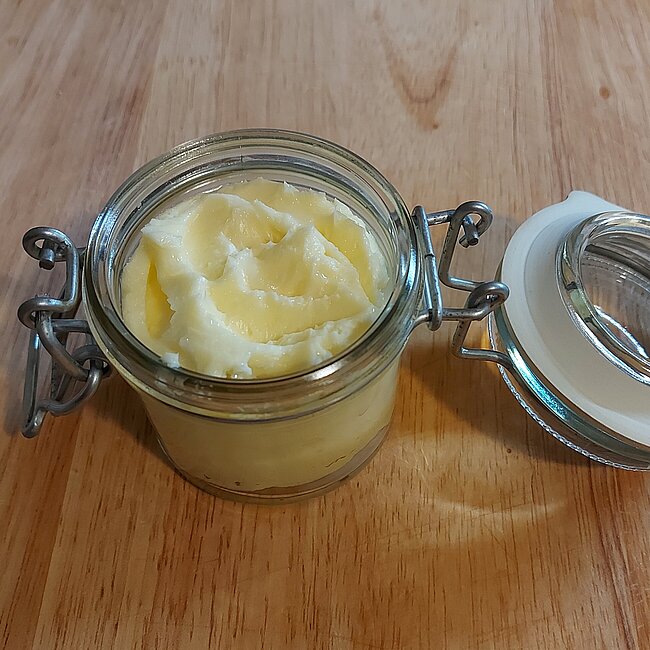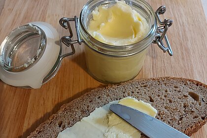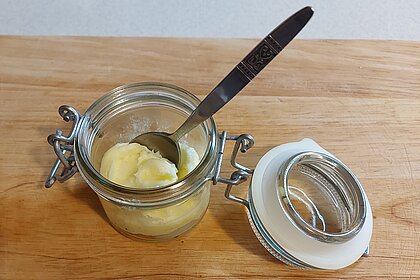 Zum Schluss füllst du die frische Butter in ein verschließbares Glas um.