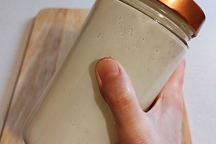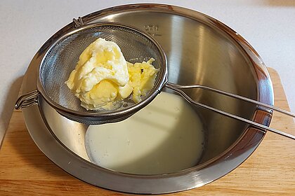 Jetzt bereitest du eine Schüssel mit einem Sieb vor und gießt den Inhalt des Glases hinein. Die Butter bleibt im Sieb zurück, während die Flüssigkeit, die sogenannte Buttermilch, in der Schüssel landet.