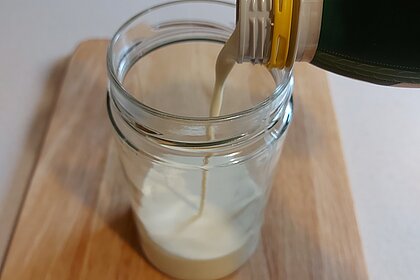 Zuerst gießt du das Schlagobers in ein sauberes Glas und verschließt es gut. Lass dir dabei gerne von einer*einem Erwachsenen helfen.