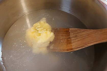 Um die Butter zu reinigen, drückst du den Klumpen in einer zweiten Schüssel mit kaltem Wasser leicht aus.