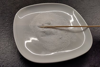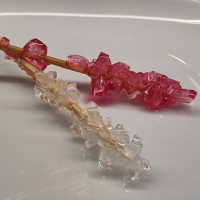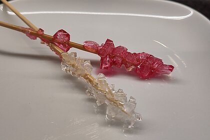 Warum entstehen Kristalle? Heißes Wasser kann viel mehr Zucker aufnehmen als kaltes. Wenn das Zuckerwasser abkühlt, kann es den ganzen Zucker nicht mehr halten. Der Zucker setzt sich dann am Holzspieß ab und bildet funkelnde Kristalle.