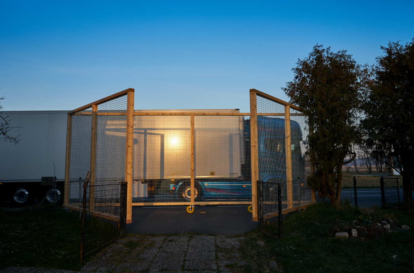 Der bislang nicht als solcher wahrgenommene Ein- und Ausfahrtsraum auf die Landstraße in der Größe von 28 m² wird zum öffentlichen Raum hin geöffnet. Das nicht Beachtete, nicht Reflektierte, Orte, die nicht einmal als unbedeutend, weil nicht gesehen oder als solche erkannt werden, Übergänge interessieren Alfred Lenz. Eine leichte, mit Rollen mobil ausgestattete, semitransparente dreiflügelige Struktur stellt eine Verbindung zwischen dem Innen und Außen her. Diese die Grenzen von Architektur, Design, Nutzobjekt und Kunst überschreitende und in ihrer Konstruktion möglichst reduzierte Skulptur verunklärt bewusst jede Trennung von Privatem und Öffentlichem, Kunst und Leben und befragt sie gleichzeitig. Als durchlässige Kulisse erschließt sie sich als Kunstraum, Bühne, Theater oder Oper, fungiert als Erlebnishorizont für von Lenz eingeladene Künstler*innen aller Sparten im Dialog mit der unmittelbaren Umgebung. Alles kann für ihn immer mehreres sein, wird der Eindeutigkeit entzogen, um den Charakter des Vorläufigen und Wandelbaren als Idee des Möglichen in der ihr angedachten Vorschlagsidentität zu öffnen.
