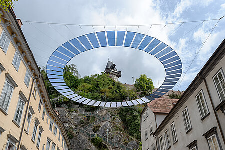 Hoch über dem beliebten Schlossbergplatz schwebt in leiser Balance ein großer runder Farbring, der die blauen Himmelsfarben in sich versammelt. Der Schweizer Naturforscher Horace-Bénédict de Saussure entwickelte den ursprünglich nur knapp über handtellergroßen Cyanometer im 18. Jahrhundert, um durch Vergleich der Farbintensität auf die Beschaffenheit der Atmosphäre zu schließen und meteorologische Erkenntnisse zu sammeln. Alexander von Humboldt machte das Farbrad mit seinen Amerika-Erkundungen weithin bekannt.