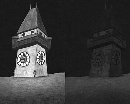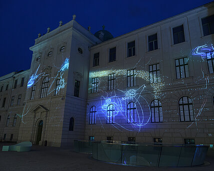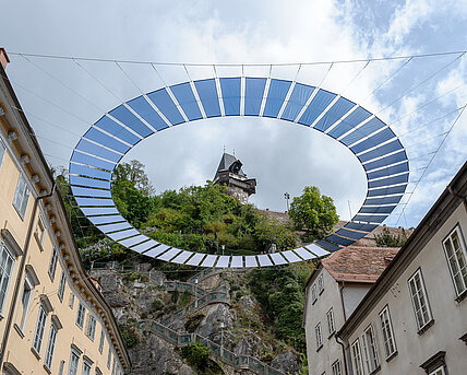 Tagsüber bei Sonnenschein verdoppelt sich der Strauß über den wandernden Schattenwurf und bei Dunkelheit, angeschlossen an das Straßenbeleuchtungsnetz der Stadt Graz, erhellen die Laternen Fassade und Platz und vervielfältigen die Schatten ihrer selbst.