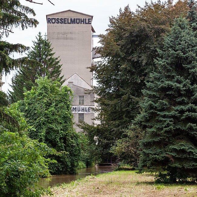 Die Rösselmühle als Objekt und Produktionsstätte bot vielseitige Zugänge, die das Projekt OEVERwerk in Form von Installationen, zeitbasierten Arbeiten und themenspezifischen Mühlentouren erlebbar machte. So griffen unterschiedliche Rundgänge die Geschichte und Funktion der Mühle, Architektur und Landwirtschaft, die Beziehung zwischen Industrie und Natur sowie den Bezug zu Kunst im öffentlichen Raum auf.