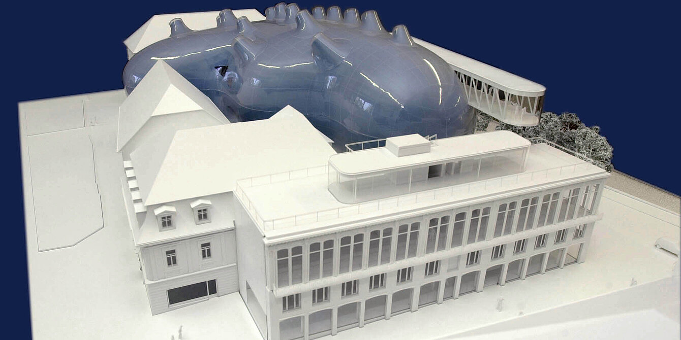 Als der Platz für das Museum auf seinen jetzigen Standort am rechten Murufer verlegt wurde, fand die Drachenhaut ihren Weg über den Fluss, ergoss sich in den unregelmäßigen Grundriss des neuen Geländes, hüllte sich um die beiden angehobenen Plattformen des Museums und schuf so ein Raumgefüge, das weder Dach noch Wände noch Boden aufwies, sondern ein nahtloses Ineinanderübergehen der drei Elemente.