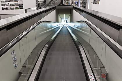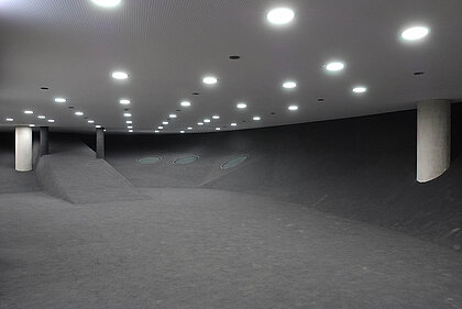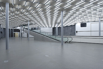 Auf einem 30 Meter langen mechanischen Laufband, „Travelator“ oder „Pin“ genannt, durchstoßen die Besucher*innen die Haut („Skin“) des Gebäudes, durchqueren den Kinder- und Jugendraum (Space03) und gelangen schließlich auf die erste Ausstellungsebene, dem Space02. Herausnehmbare Neonröhren unter der Flachdecke, entlang eines ortogonalen Rastersystems angelegt, erzeugen künstliches Licht. Ein weiteres Laufband führt in die zweite Ausstellungsebene, dem Space01, der an seinem höchsten Punkt acht Meter erreicht. Die Ausstellungsflächen erhalten regulierbares Tageslicht durch die sogenannten Nozzles – rüsselartige Öffnungen, die nach außen gerichtet sind. Eine davon fokussiert den Uhrturm und stellt damit eine Verbindung zwischen den beiden wichtigen Sehenswürdigkeiten der Stadt her. Für künstliches Licht sorgen eine expressiv anmutende, spiralförmige Neonbeleuchtung und zuschaltbare Spots.