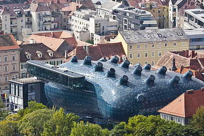 Spektakulär ist die blau schimmernde Blase des Kunsthauses, die sich über dem gläsernen Erdgeschoss erhebt. Mit einer Spannweite von bis zu 60 Metern umspielt die biomorphe zweischalige Haut eine solide Stahlbetonkonstruktion. Diese wurde zweistöckig ausgeführt.