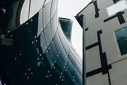 In den Obergeschossen verbinden Brücken den Neubau mit dem „Eisernen Haus“, dessen denkmalgeschützte Gusseisenkonstruktion – die älteste Mitteleuropas – im Zuge der Errichtung des Kunsthauses Graz behutsam renoviert wurde.