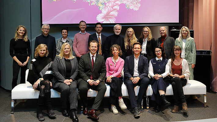 Kulturstadträtin Claudia Unger, Kulturlandesrat Karlheinz Kornhäusl, Katrin Bucher Trantow, Marko Mele, Andreja Hribernik (vorne) mit einem Teil des Projektteams von BLOOM bei der Themenpräsentation am Montag, Foto: Universalmuseum Joanneum/J.J. Kucek
