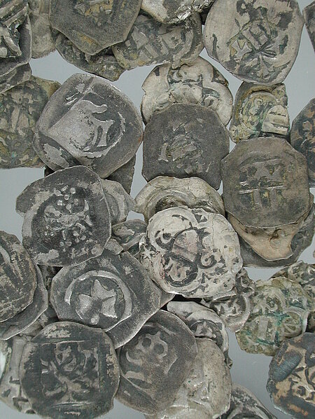Das Gewicht der Münzen schwankt zwischen 0,20 und 0,45 g. Mit Ausnahme von zwei Pfennigen aus Augsburg weisen die Münzen eine minderwertige Silberlegierung auf. Sie sind zu jenem schlechten Geld zu zählen, das aufgrund seines geringen Gewichtes und seines niedrigen Silbergehaltes niemand mehr haben wollte.