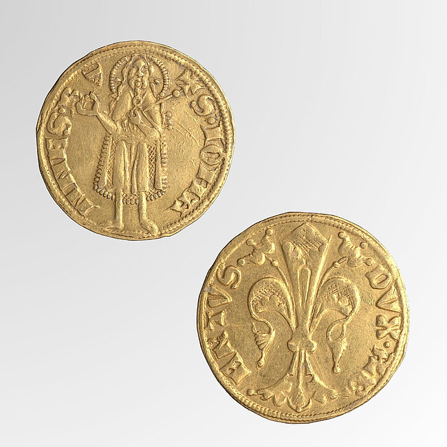 Die Judenburger Goldgulden tragen auf der Vorderseite den Namen und das Bildnis Johannes’ des Täufers. Er war der Stadtheilige von Florenz, dessen Goldmünzenprägung für viele mitteleuropäische Prägestände Vorbildwirkung hatte. Als in Folge der Kreuzzüge und des daraus entstandenen Handelsverkehrs mit dem östlichen Mittelmeergebiet Gold nach Italien gelangte, hatte die reiche italienische Handelsstadt 1252 die Goldprägung aufgenommen. Die Goldmünze aus Florenz wurde Florenus genannt, nach dem Symbol der Stadt, einer Lilie.