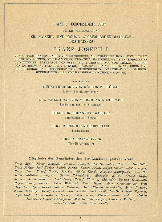 Spurt in die Moderne: In die Amtszeit von Bürgermeister Wilhelm Kienzl (1873–1885) fallen wegweisende Reformprojekte: So wird 1875 der Neubau der Staatsgewerbeschule (heute HTBLVA Graz-Ortweinschule) bewilligt, 1876 folgt das städtische Schlachthaus. 1878 ist ein Jahr des Verkehrs: Die Pferdebahn wird eingerichtet und der Südbahnhof erbaut, 1879 beginnt die Planung des Zentralfriedhofes. Aber auch die „sociale Frage“ wird nicht vernachlässigt: Die Kommune finanziert Suppenküchen, Waisenhäuser und Krankenpflege; brotlos gewordene Arbeiterfamilien werden durch Spenden unterstützt.