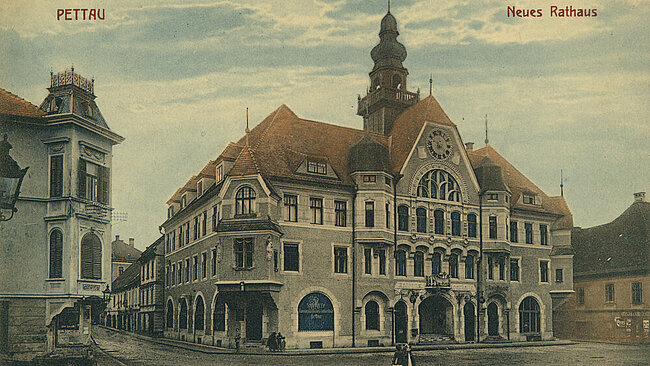 Nationales Imponiergehabe: Auch in der Untersteiermark dienen Rathäuser der kommunalen Selbstvergewisserung. Auch sollen sie das Überlegenheitsgefühl der deutschsprachigen Oberschicht ausdrücken. Das 1906–1907 nach Entwurf von Max Ferstl erbaute, in einem fiktiven „altdeutschen“ Stil gehaltene Rathaus von Pettau/Ptuj ist hierfür typisch.