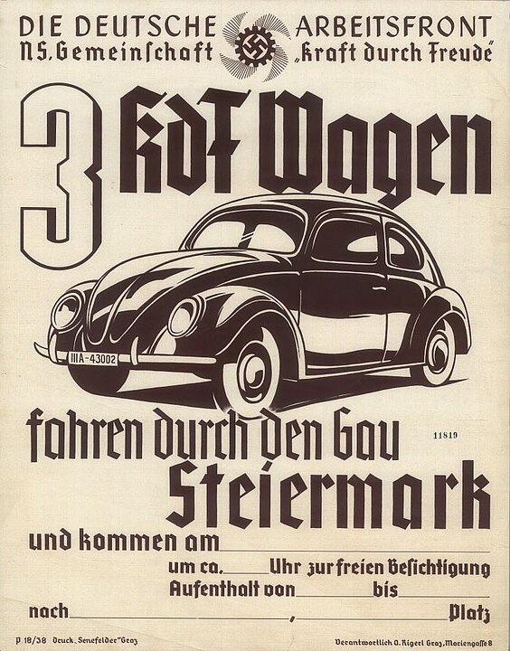 Das Versprechen der „NS-Volksgemeinschaft“ war stets auch ein Versprechen auf eine bessere Zukunft. „Arbeit und Brot für alle“ sowie die „Demokratisierung des Konsums“ sollten breite Teile der Arbeiterschaft für den Nationalsozialismus gewinnen. Daher pries die NS-Propaganda ab dem März 1938 neue Arbeitsplätze, neue Sozialleistungen und Möglichkeiten der aktiven Freizeitgestaltung an. Mit der NS-Gemeinschaft „Kraft durch Freude“ sollten die „Volksgenoss*innen“ auf den Reichsautobahnen erstmals in den Urlaub fahren. „Ehestandsdarlehen“ sollten Jungvermählten die Gründung eines eigenen Haushalts in einer neu errichtete Wohnsiedlung erleichtern. All diese Versprechen waren aber stets mit arbeitsmarktpolitischen und ideologischen Zielen des NS-Regimes verbunden. Finanziert wurden sie durch eine steigende Waffenproduktion sowie durch Raub an der jüdischen und europäischen Bevölkerung.