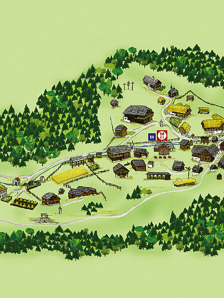 Bauernhäuser aus Südtirol wurden mit ihren hölzernen Dächern und darauf gelegten Steinen besonders an die schneereichen Winter angepasst. In der Südtiroler Baugruppe befindet sich außerdem ein angelegter Naturteich, durch den der Enzenbach fließt und der einen Lebensraum für viele Pflanzen- und Tierarten bietet.