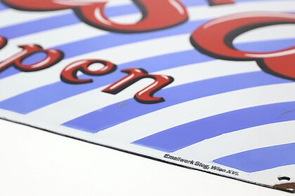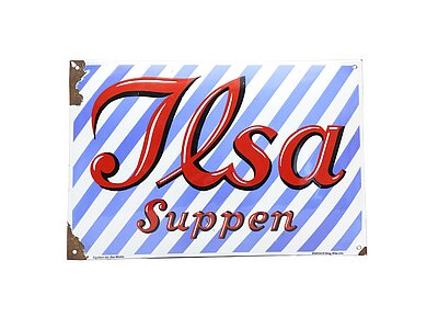 In der ersten Hälfte des 20. Jahrhunderts zierten Emailschilder die Fassaden der Geschäftshäuser. Die Technik des Emaillierens von Edelmetallen war bereits seit der Antike bekannt, doch mit dem Beginn der Industrialisierung zur Mitte des 19. Jahrhunderts gelang es, auch Eisenbleche so zu behandeln, dass die Emailschicht auf dem Trägermaterial haften blieb. Zeitgleich setzte auch jene Entwicklung im Bereich der Konsum- und Luxusartikel ein, die zur Prägung von Markenartikeln wie Persil, Maggi etc. führte. Um die Konsument*innen auf die Waren aufmerksam zu machen, bot sich das Emailschild mit seinen bunten Werbebotschaften optimal an und prägte diesen neuen Zweig der Reklame um 1900. Damalige Marktführer wie Oetker, Henkel oder Maggi erkannten schnell die verkaufssteigernde Wirkung der Emailreklame. Zunächst waren es reine Schriftschilder, die zwei- oder dreifarbig ihre Werbebotschaft ausriefen. Kurz darauf folgten auch Produktabbildungen oder figürliche Darstellungen. Wurden Emailschilder vor dem Ersten Weltkrieg noch aufwendig von Hand hergestellt, so fand die Emailreklame ihren Höhepunkt in den 1920er- und 1930er-Jahren. Der Zweite Weltkrieg brachte diesem Industriezweig ein jähes Ende und die Schilder wurden in den 1950er-Jahren aufgrund der billigeren Produktion von Papierplakaten und des schnelllebigen Konsummarktes aus dem Straßenbild verdrängt. Heutzutage gehören Emailschilder zu begehrten Sammlerobjekten. Was den Deutschen Maggi und den Österreichern Graf, war den Tschechen ILSA – eine Suppenwürze. Dieses Reklameschild stammt aus den 1920er-/30er-Jahren.