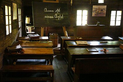 Das Klassenzimmer in unserer Schule aus Prätis gibt einen Einblick in den streng geregelten Schulalltag vergangener Generationen. Mehrere Kinder saßen dicht nebeneinander auf den Sitzflächen der Schulbänke. Diese Schulbank ist 174 cm lang und 65 cm hoch.