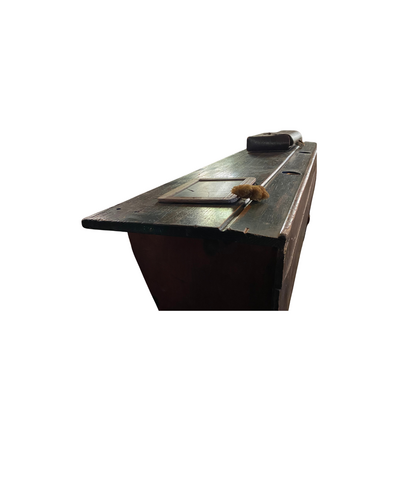 Die Ausstattung der Bank verweist auf die damaligen Lernmethoden: Tintenfässer, die in den Löchern an der Vorderkante der Schreibfläche standen, waren für die älteren Kindern, während jüngere zunächst mit Griffel und Schiefertafel arbeiteten. Schulmaterialien mussten immer sorgfältig behandelt werden, Bücher wurden regelmäßig kontrolliert, und auch die Reinigung der Schiefertafeln war vorgeschrieben.
