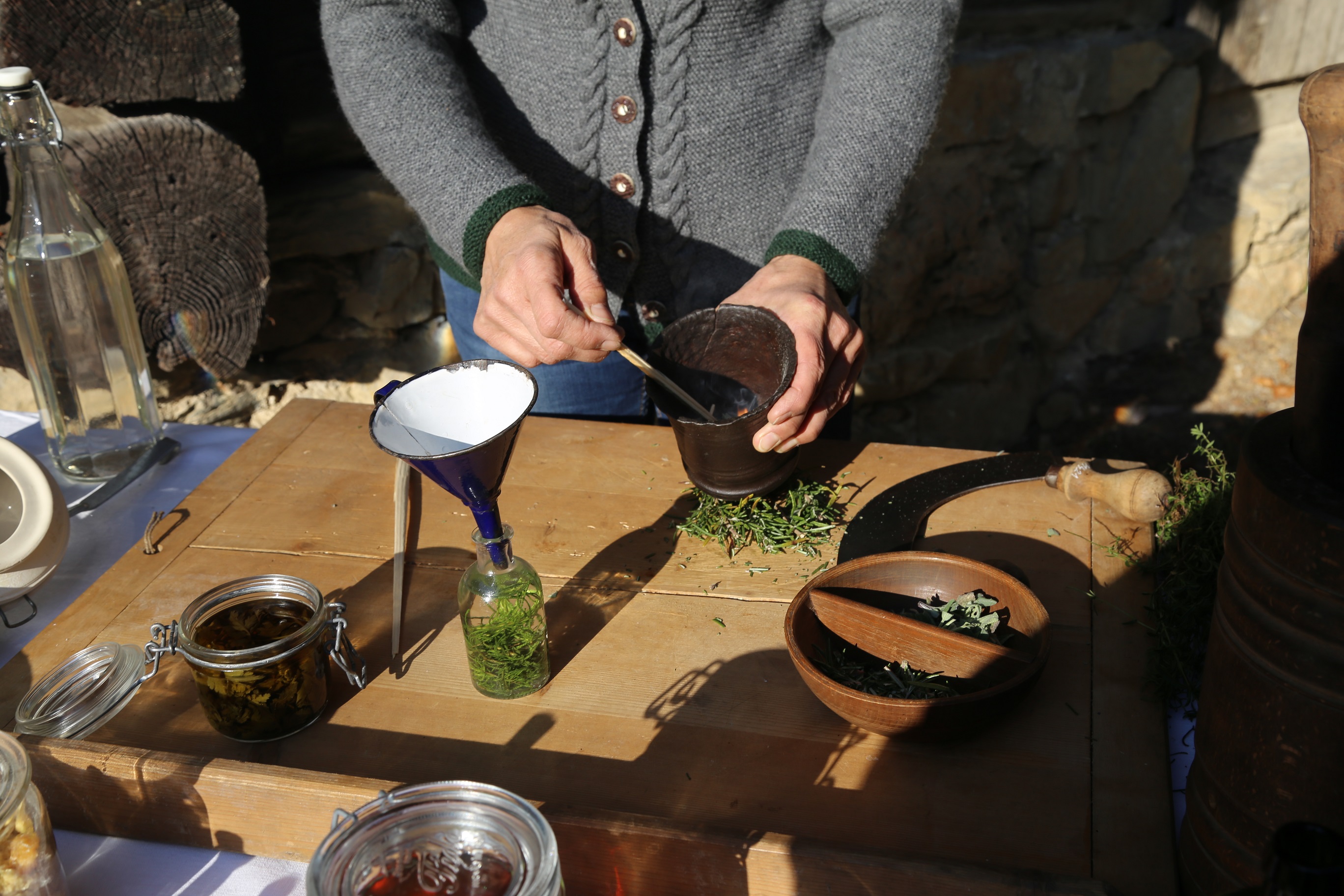 Fast jeder Bauernhof verfügte über einen eigenen Hausgarten, in dem Heilpflanzen, Gewürzkräuter und Blumen kultiviert wurden. Die Bewohner*innen kannten die Wirkung der Kräuter aus ihrer Umgebung genau. Aus ihnen stellten sie Tees, Salben, Pflaster und Tinkturen her – basierend auf überliefertem Wissen, das vor allem von Frauen weitergegeben wurde. Neben heimischen Kräutern wurden auch teure Gewürze und „Wunderdrogen“ aus dem Orient gehandelt, die sich nur Wohlhabende leisten konnten. Die Landbevölkerung nutzte das, was sie selbst sammelte oder anbaute.