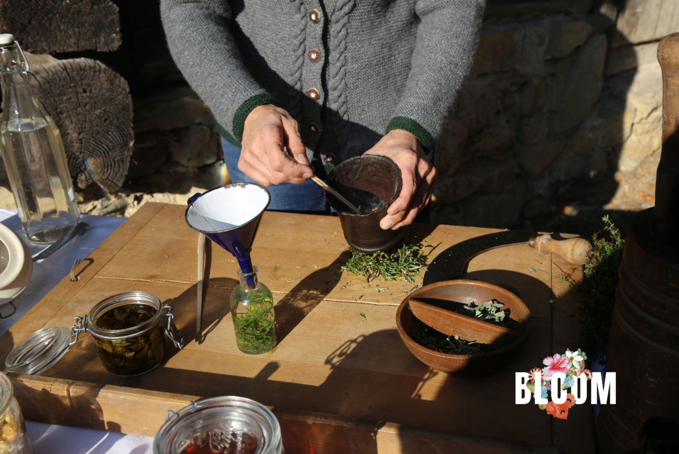 In früheren Jahrhunderten war medizinische Hilfe auf dem Land oft nur schwer zugänglich. Die Wege zum nächsten Arzt waren weit, eine Behandlung war für viele Bauern kaum leistbar und die Abgeschiedenheit vieler bäuerlicher Höfe verlangte nach größtmöglicher Selbstständigkeit. Daher vertraute die ländliche Bevölkerung auf das über Generationen überlieferte volksmedizinische Wissen und versuchte sich zunächst selbst zu kurieren. Die Ausstellung Blühende Medizin im Österreichischen Freilichtmuseum Stübing bietet einen Überblick über die Entwicklung und Bedeutung der Heilpflanzen – von der Antike über die Klostergärten des Mittelalters bis hin zur Volksmedizin und ihrer Wirkung in der heutigen Zeit. Dabei wird deutlich, wie eng das Leben der Menschen einst mit der Natur verbunden war – und wie viel von diesem alten Wissen bis heute erhalten geblieben ist und weiterhin genutzt wird. Fast jeder Bauernhof verfügte über einen eigenen Hausgarten, in dem Heilpflanzen, Gewürzkräuter und Blumen kultiviert wurden. Die Bewohner*innen kannten die Wirkung der Kräuter aus ihrer Umgebung genau. Aus ihnen stellten sie Tees, Salben, Pflaster und Tinkturen her – basierend auf überliefertem Wissen, das vor allem von Frauen weitergegeben wurde. Neben heimischen Kräutern wurden auch teure Gewürze und „Wunderdrogen“ aus dem Orient gehandelt, die sich nur Wohlhabende leisten konnten. Die Landbevölkerung nutzte das, was sie selbst sammelte oder anbaute.