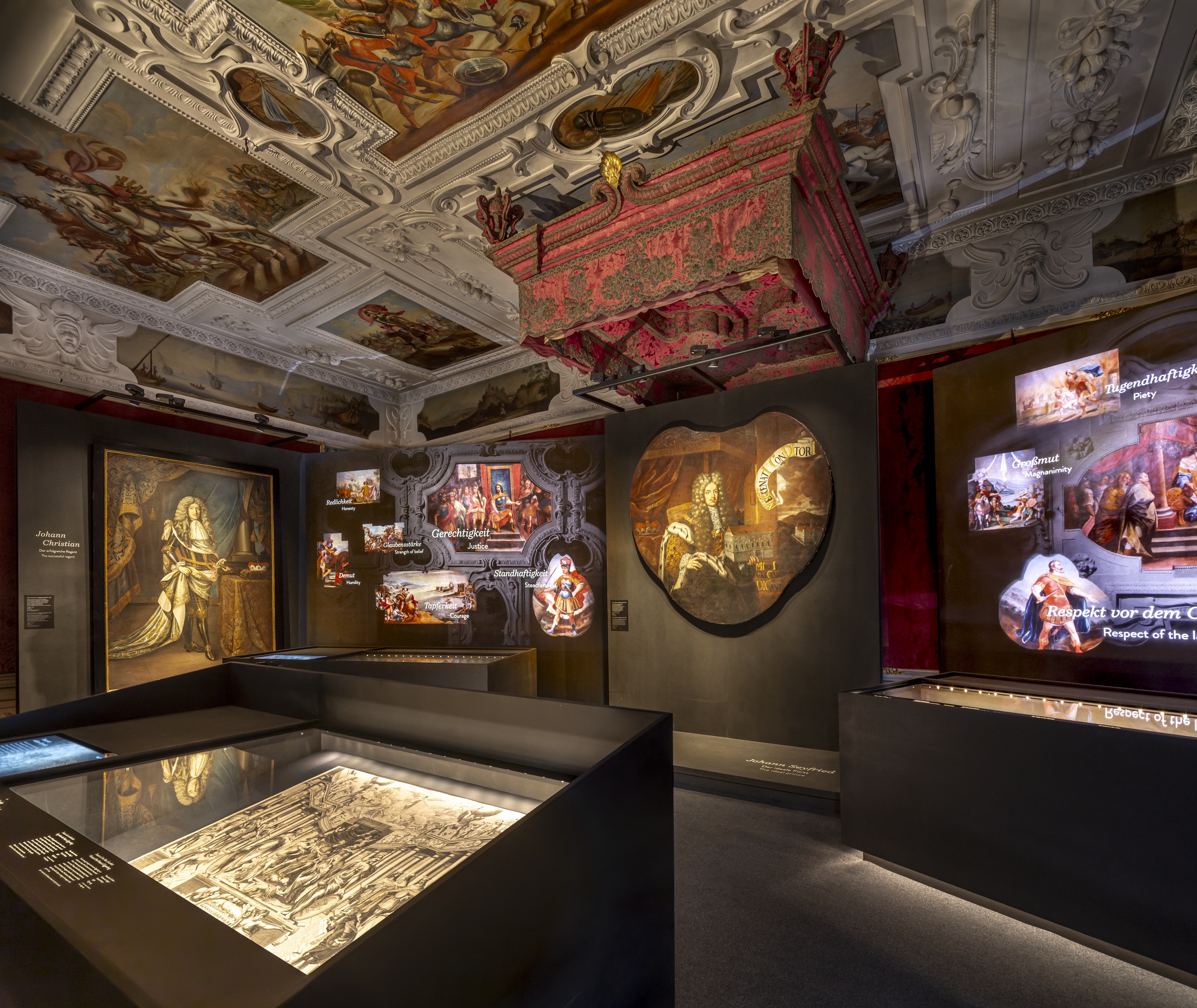 Landesdirektor der GRAWE Anton Genseberger, wissenschaftlicher Geschäftsführer Universalmuseum Joanneum Marko Mele, das Kurator*innen-Team der Jubiläumsausstellung „Schloss Eggenberg: Inszenierung der Welt“ Barbara Kaiser, Stefan Albl, Paul Schuster, Kulturlandesrat Karlheinz Kornhäusl, Landesrätin Claudia Holzer, das Kurator*innen-Team der Ausstellungen „Graz 1699“ und „Die Eggenberger und das Geld“ Daniel Modl, Karl Peitler, Marc Philipp Wahl, Sarah Kiszter, kaufmännischer Geschäftsführer Universalmuseum Joanneum Josef Schrammel, Kurator der Pavillons Günther Holler-Schuster, Prokurist der Raiffeisen-Landesbank Johannes Derler, v.l.