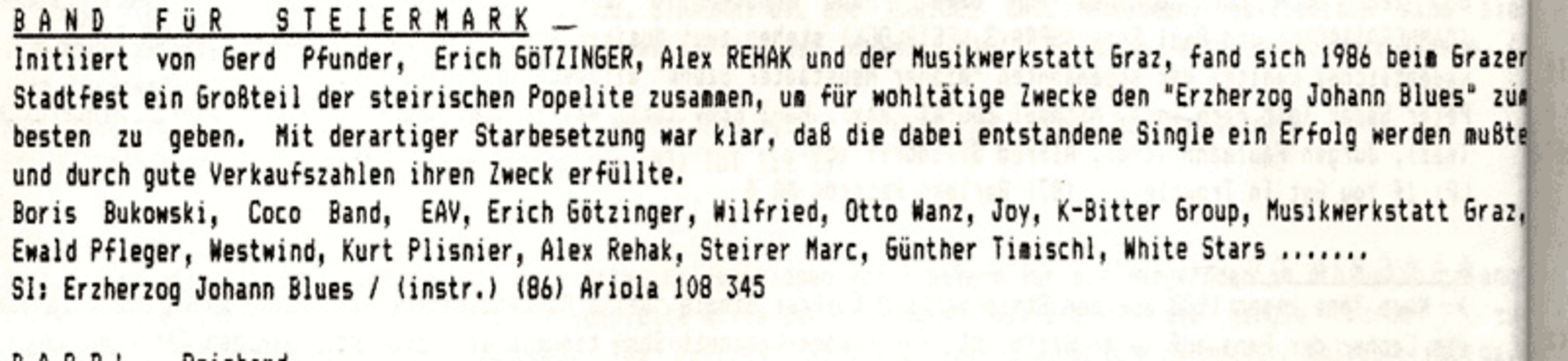 Die Gründung der „Band für Steiermark“ geht auf die Idee zurück, für das Steirerkrone-Stadtfest 1986 eine poppige Hymne auf die Steiermark und ihre Rockszene zu komponieren. Alex Rehak tat dies zusammen mit Klaus E. Kofler und Ronnie Herbolzheimer: Der „Erzherzog Johann Blues“ war geboren. Eine Art Allstar-Band steirischer Musiker*innen wurde zusammengestellt, viele bekannte Interpret*innen der steirischen Pop-Szene beteiligten sich an dem Benefizprojekt „Band für Steiermark“. Das Projekt wurde eine jahrzehntelange Erfolgsgeschichte und unterstützte z. B. wichtige Aktionen wie „Licht ins Dunkel“ oder „Special Olympics Österreich“.
